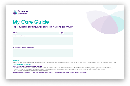 This guide is designed to help your care team better understand your loved one’s Rett syndrome symptoms and treatment journey with DAYBUE. You can also personalize it by adding specific details about them and your family.